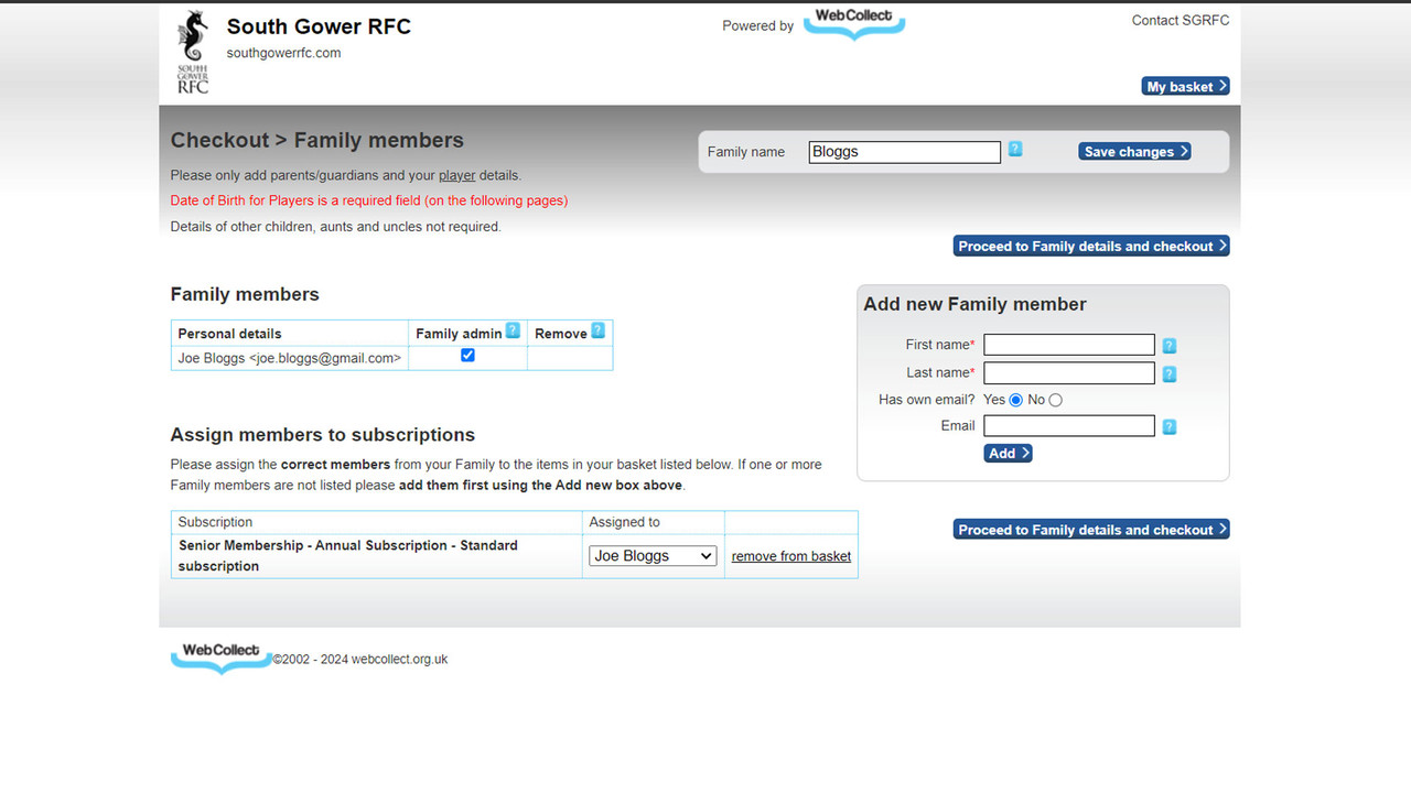 STEP 8: Select 'Proceed to Family details and checkout' and add details for EACH Player and update the parent/guardian details. If you’re applying for a Single Player Membership - Youth (over 18), Senior, or Social Membership - no guardian details are required. Once updated select 'proceed to check out'
