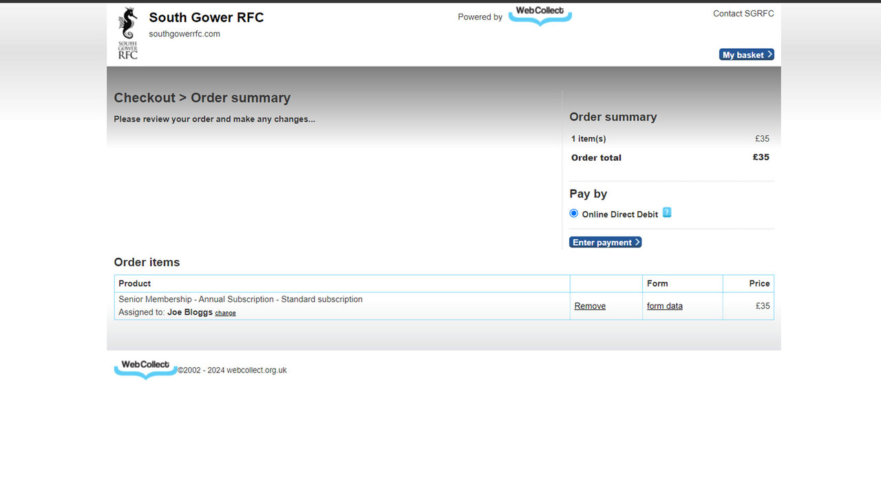 STEP 10: Review your order summary and click on ‘enter payment’. You will be directed to the GoCardless secure payment page. Please note - only direct debit payments are allowed. If this is not possible, e.g. you do not have a bank account, please contact the Membership Secretary.